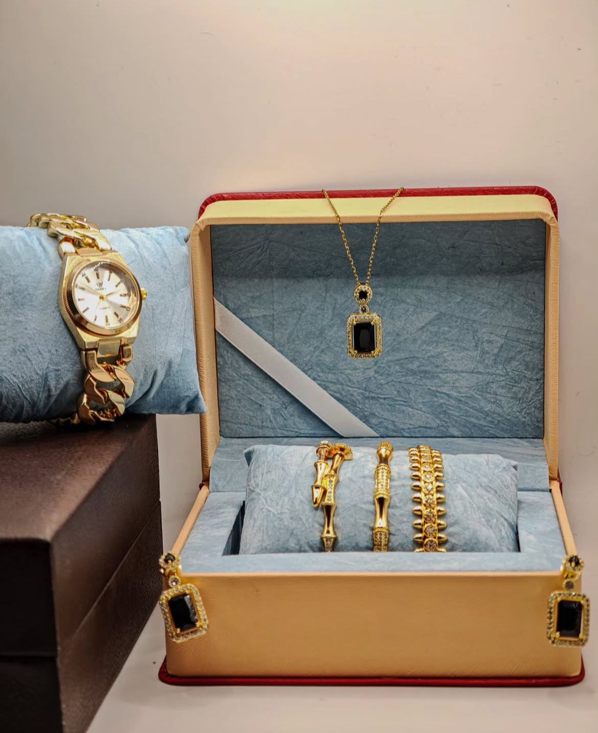 يأتي الطقم داخل علبة فاخرة تجمع بين الأناقة والجودة، مما يجعله خيارًا مثالياً كهدية في المناسبات الخاصة مثل الأعراس، الخطوبة أو أعياد الميلاد.